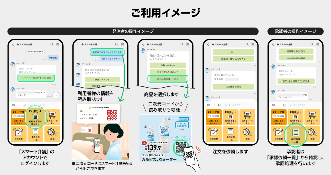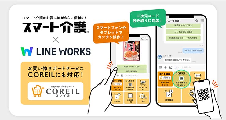 これまでの「スマート介護」購買アプリでは、スタッフがスマホやタブレットなどから「LINE WORKS」上のチャット形式で注文していました。今回、パソコンから出力した「コレイル」の利用者情報を含む二次元コードをラベルシールに印刷し、利用者様のお部屋に設置することにより、利用者様を利用者リストから選択する方法に加えて、アプリのメニューからカメラを起動して二次元コードにかざすだけで指定の利用者の注文がスピーディに開始できます。