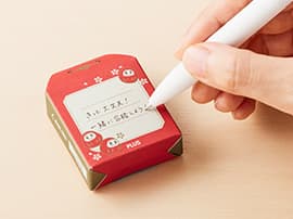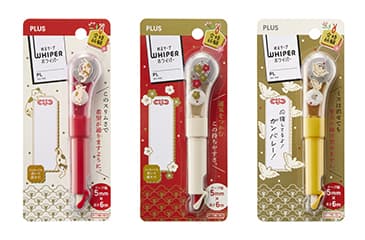 ラインアップは、消しゴム、修正テープ、テープのり、指サック、ダブルクリップの5製品。デザインには「猫」「梅」「鳩」「だるま」などのゲン担ぎモチーフと、紅白・ゴールドといった縁起の良いカラーリングを取り入れています。各製品に応援メッセージを書き込める欄を設けているので※1、自分で使うだけでなく、プレゼントにも活用していただけます。