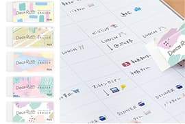 「デコラッシュ」は、薄くて凸凹しない転写式フィルムテープ。手帳が分厚くなったり、インクのにじみや裏抜けもなく、イラストを描いたような仕上がりに。長さも自由にコントロールできるので、ワンポイントデコ、長く引いてラインデコも思いのままです。