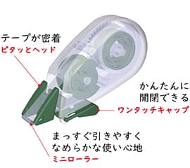 独自機能として、指1本で自動開閉可能な「ワンタッチキャップ」や、直進性に優れ、なめらかな使い心地を実現する「ミニローラー」、テープ浮きを防ぎ密着性を高める「ピタッとヘッド」、左利き対応など、抜群の使いやすさを実現しています。