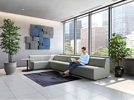 オフィスでの使い方やレイアウトの変更に対応できるフレキシブルなソファーシリーズである。ユーザーの姿勢に寄り添う座面クッションの設計やカバーリング方法など、機能性を高める工夫がシンプルな形状にまとめられている。同シリーズのテーブルと組み合わせることで、さまざまなオフィス環境での使用や自由度の高いレイアウトを可能にしている。森林の健全化に貢献する国産木材や、環境に配慮したファブリックの使用など、素材の選定も高く評価できる。