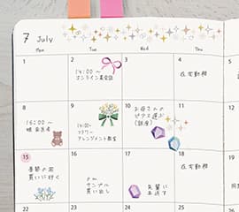「デコラッシュ」は、薄くて凸凹しない転写式フィルムテープ。手帳が分厚くならず、インクのにじみや裏抜けしないイラストを描いたような仕上がりに。長さも自由にコントロールできるので、ワンポイントデコ、長く引いてラインデコも思いのままです。