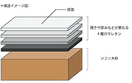 硬さの異なる4種のウレタンを積層することで奥行感のある座り心地を実現しています。木枠をベルト状に張り込んだ伸縮効果により底突き感を軽減し、快適な着座をサポートします。