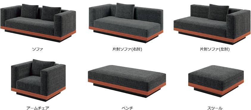 ラインアップは、「ソファ」「片肘ソファ」「アームチェア」「ベンチ」「スツール」の5種類に加え、テーブルアイテムの「サイドテーブル」「サイドボックステーブル」「センターテーブル」「カフェテーブル」の4種類から自由に選択が可能です。