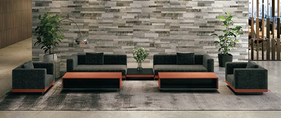 「D8 Dolcevita」のアイテムを組み合わせることで、一般的な対面型からL字型までさまざまなレイアウトを創造できます。役員室向け応接室では対面式の応接家具として、またエントランスやレセプションでは複数のソファを組み合わせたL字型のレイアウトに配置することで、共有スペースとしての空間づくりが可能となります。自由度を高め多彩なシーン提案を可能にする、プラスらしい発想を盛り込みました。