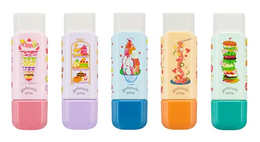 今回は“がんばった自分へのごほうび”に思わず食べたくなる、大きいパフェやアフタヌーンティー、山盛りの海鮮丼など5種類のおいしいごほうびフードをケースにあしらいました。使い終わった後も中身の消しゴムを入れ替えて使い続けていただけます。