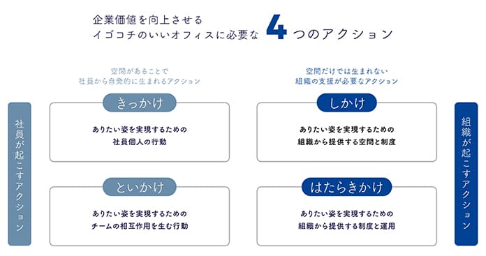 独自のフレームワーク「4つのアクション(きっかけ・といかけ・しかけ・はたらきかけ)」により、イゴコチのいいオフィスを実現するために必要なアクションを整理。社員が自発的に生み出すアクションから企業側に求められるアクションまで分かりやすく分類し、企業の目指す理想の姿と働き方実現のために必要な要素を見える化します。