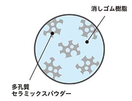 「富士山消しゴム」は、1989年に発売を開始したロングセラー消しゴム「エアイン」と同じ消しゴム樹脂を採用。多孔質セラミックスパウダーが無数のカドを生み出し、“いつもカドで消すような軽く快適な消し心地”を実現しています。