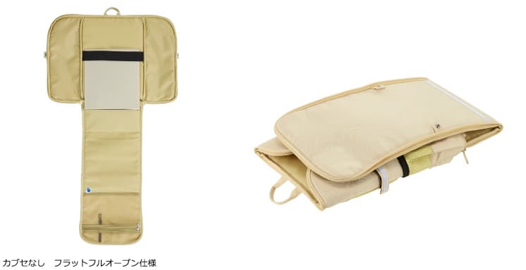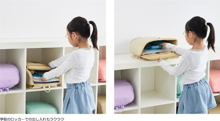 従来のランドセルにある「カブセ」を無くしたファスナー式なので、開閉位置を自由に変えることができます。これにより上からも横からもパッと荷物の出し入れが可能に。また、ファスナーを全開にすると、ガバっとフルフラットに開いて中身を確認できます。使わないときは、コンパクトに畳んで収納も可能です。