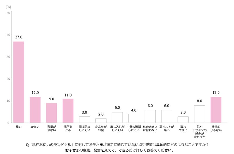 今回の調査では、現在使用しているランドセルについて、実際にランドセルを使用している先輩小学生のお子さまのご意見をふまえて、詳しくお聞きしました。その結果、やはり「重い」(37%)が最多回答に。また、「機能的でない」「かたい」(12%)、「(大きくて)場所をとる」(11%)、「容量が少ない」(9%)、「出し入れがしにくい」(5%)と実際に使ったうえでの不満点も上がり、ランドセル自体が軽いことだけではなく、機能性や容量が重要との気づきも見られました。