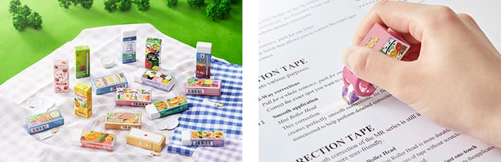 ベースとなる製品は、いずれも使いやすさと機能性にこだわっており、「ホワイパー 紙ケース入り修正テープ」「ノリノ 紙ケース入りテープのり」は各種賞※1を受賞しています。かわいいだけでなく使い心地も抜群です。勉強にちょっぴり疲れたときも、おいしそうな絵柄に気持ちがほっと癒されて、もうひと頑張りできそう! お友達へのプレゼントにもおすすめです。