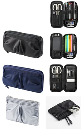 ◆「ラウンド」:マチがないコンパクトなモデルで、内部に左右2段構造の4つのポケットを搭載。文具のサイズに合わせてすっきり収納ができます。ラウンドファスナーを全て開くことで中身を一目で確認でき、出し入れもスムーズです。
