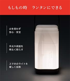 急な停電や避難生活などの非常時は、ライトを点灯したスマートフォンを入れて使う事で、製品全体がやさしく光る「ランタン」として使用することができます。