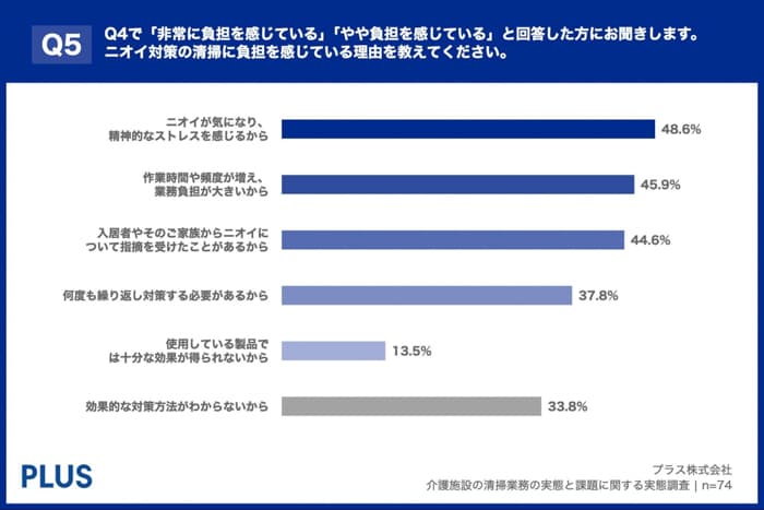 「Q5. Q4で「非常に負担を感じている」「やや負担を感じている」と回答した方にお聞きします。ニオイ対策の清掃に負担を感じている理由を教えてください。(複数回答)」(n=74)と質問したところ、「ニオイが気になり、精神的なストレスを感じるから」が48.6%、「作業時間や頻度が増え、業務負担が大きいから」が45.9%、「入居者やそのご家族からニオイについて指摘を受けたことがあるから」が44.6%という回答となりました。