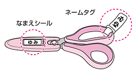 キャップ・ハンドルに貼る「なまえシール」と、ハンドルに留める「ネームタグ」を付属。「なまえシール」は2枚あるので、貼り直しや書き直しができ、自分のはさみがすぐに分かります。