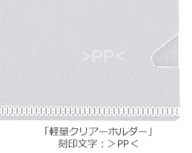 「軽量クリアーファイル」「軽量クリアーホルダー」ともプラスチック各部品の素材をすべてポリプロピレンに統一。より効果的にリサイクルしやすい単一素材の設計です。廃棄時にもわかりやすいよう「>PP<」の材質表記を本体に入れています。