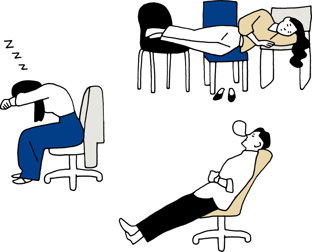 「業務中の眠気でパフォーマンスが下がると思う人」77%*、「オフィスに昼寝制度や仮眠スペースを設けたいと考えている企業」70%以上*。仮眠によって仕事効率がUP するという実証データもあります。心地よい環境で仮眠できれば、さらに効率UP、間違いなし。