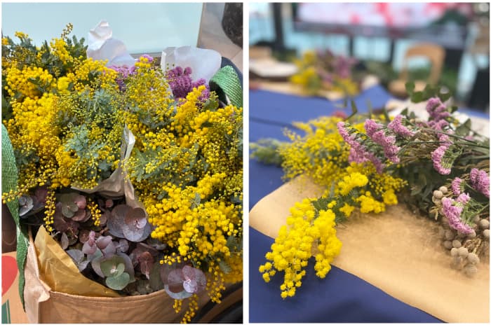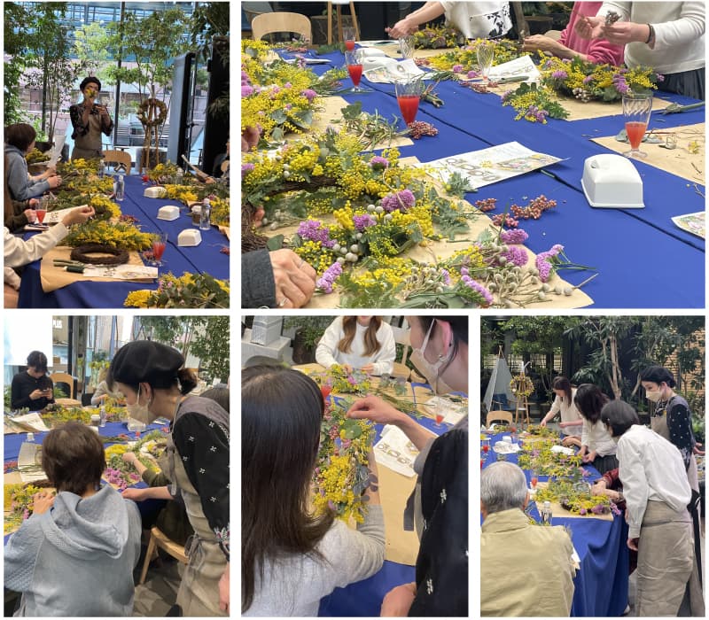 会場は、リースづくりで使用するミモザやスターチスが運び込まれ、目にも鮮やか!ここだけが一足早く春真っ盛りの様相で、ミモザのほかユーカリが優しく香っていました。