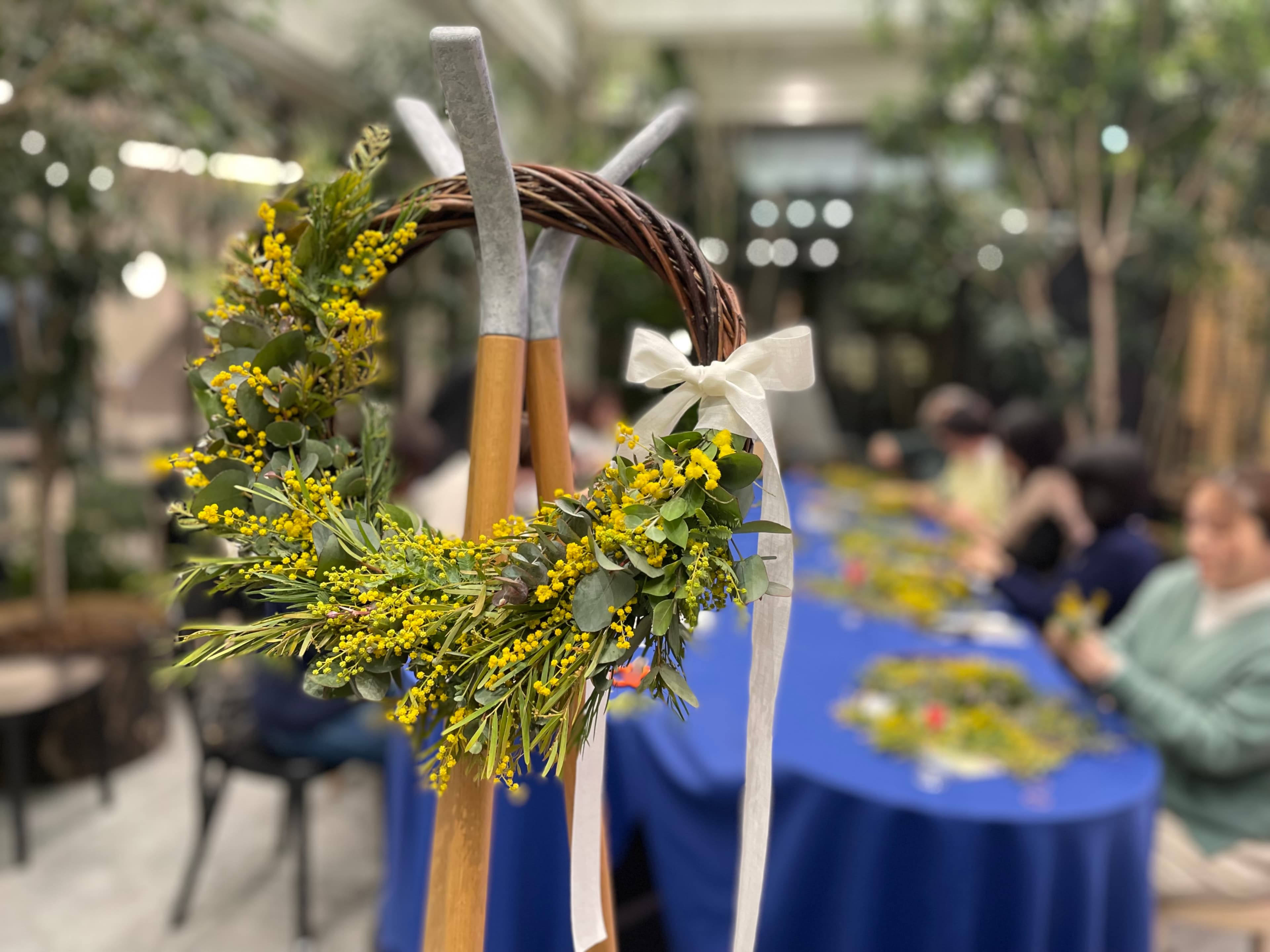 2025年2月19日(水)恵比寿ガーデンプレイス2階のSALONスペースにて、「幸せの黄色いミモザ、春三日月リースづくりワークショップを開催しました。