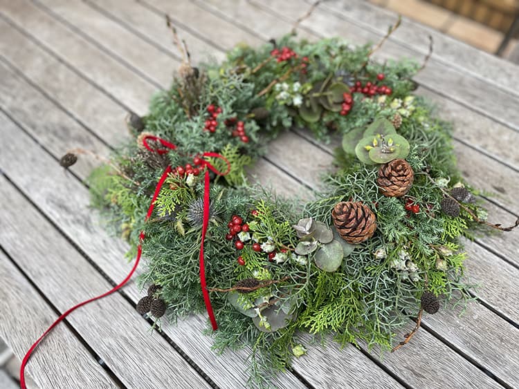 針葉樹と木の実で飾るグリーンが美しいクリスマスリースを作ります。