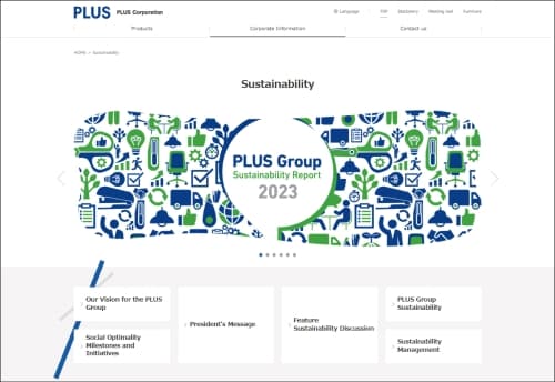 2023年9月15日、プラス株式会社は、プラスグループグローバルサイトにて「プラスグループ サステナビリティレポート2023」の英語版を発行しました。同時に「サステナビリティページ」も本年6月に公開した日本語版に合わせて刷新し公開しました。