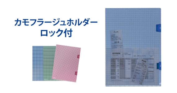 大事な書類の情報を守る透明クリアーホルダー「カモフラージュホルダー」シリーズから、全面カモフラージュ柄印刷と簡易ロック機能によりセキュリティを強化した「カモフラージュホルダー ロック付」を発売しました。