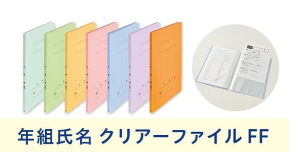 プリントに穴をあけずにファイリングするポケット式のクリアーファイルに、学校で定番のフラットファイルと同じデザインを施した「年組氏名クリアーファイルFF」を発売しました。